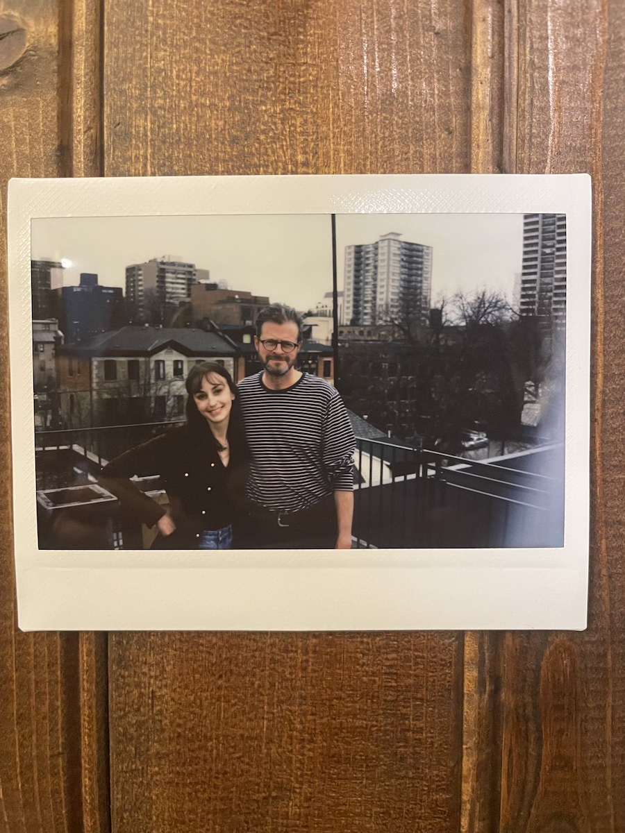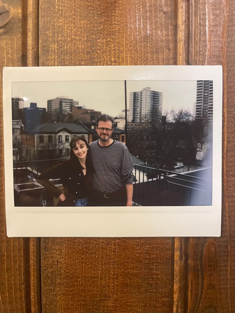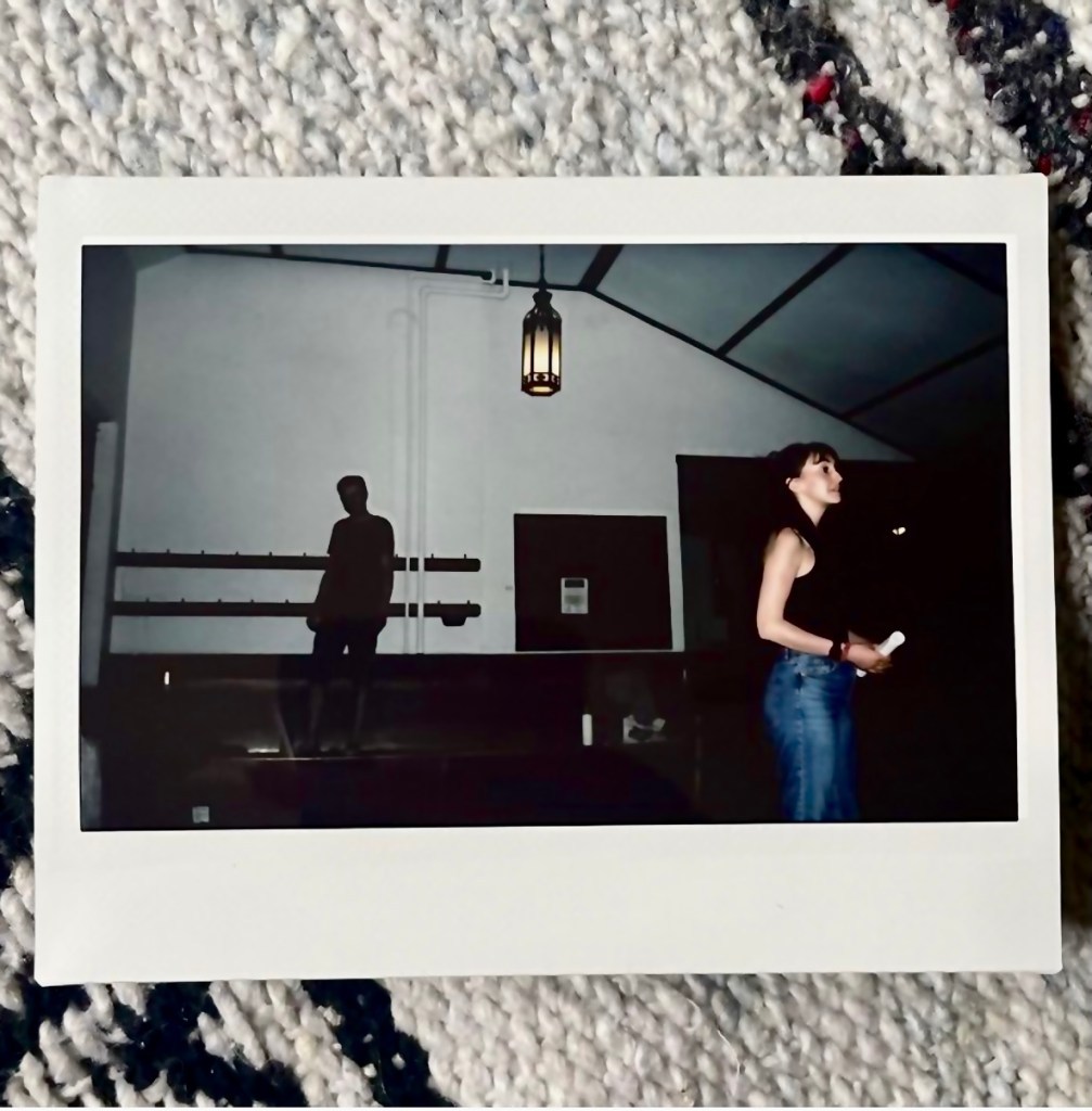 Admittedly, I had been assuming I’d be pulling inspiration from whale songs, and that’s been true to a certain extent, but the main touch point for me in this project is a photo I took on our first day of rehearsal. I’d borrowed an instant camera from a friend for a trip that I was getting ready to take with my family (more on that later), and decided to bring it along to our first read. After a work through of the script, we stepped outside onto the rooftop deck at the Hamilton Conservatory for the Arts, where I took this picture of Ray and Stephanie.