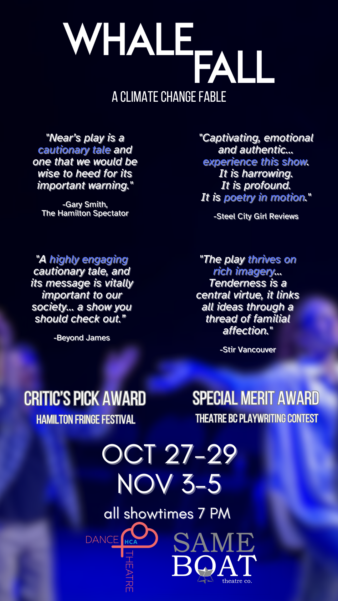 Whale Fall is a one act drama about the extinction of Canada’s southern resident orca population and the journey of one woman to find the last remaining whale while struggling to hold on to the memories of her father. Part coming of age story and part fable for the era of climate change, Whale Fall is an intimate duet between two characters as they navigate the painful waters of family, memory and species extinction. After our company’s successful run at the Vancouver Fringe Festival, Whale Fall returns to Hamilton as part of HCA Dance Theatre’s Performing Arts Sunday Series!